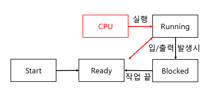 Blocked : 입/출력 중인 상태 ( CPU의 작업이 필요 X ), 단 무조건 입/출력인 상태는 아닐 수 있음.