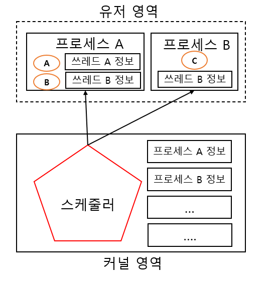 커널 레벨(Kernel Level) 쓰레드 : 프로그래머 요청에 따라 쓰레드를 생성 및 스케줄링하는 주체가 커널 인 경우, 이럴 경우에는 쓰레드를 생성해주고, 스케줄링하는 대상이 커널이 된다.